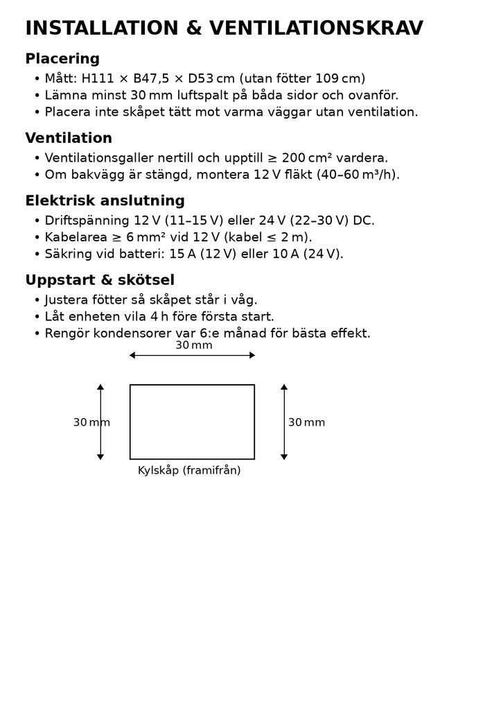 127-liters kompressorkyl med separat frysfack kyler till -18 °C på minuter. Tre sidmonterade kondensorer ger hushållsprestanda med bara 50 W drift. Drivs direkt på 12 V eller 24 V, dörren kan hängas om och LED-belysning ingår. Perfekt för husbil, båt, camper och off-grid.