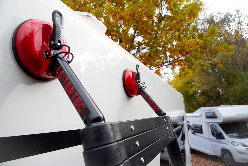 Det patenterade Leitertec-systemet använder sugkoppar i gummi för att fixeras mot fordonets kaross – helt utan verktyg eller skador på lacken. Fästet fungerar även på hammarslagsplåt och ger hög friktion tack vare sina mjuka ytor. Resultatet är stabilitet som påminner om en fast monterad stege – men med maximal flexibilitet.
