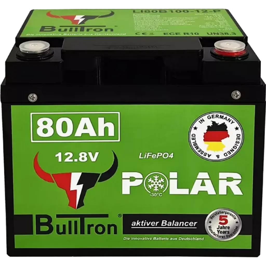 Bulltron 80 Ah LiFePO₄ Polar-batteri är byggt för kyla med drift från –30 °C till +60 °C. Den integrerade värmaren möjliggör säker laddning även under noll utan att dra från batteriets kapacitet. Det ersätter bly/GEL/AGM upp till 160 Ah vid 12 V och väger bara 8 kg, vilket frigör last och plats. Kan monteras liggande under säten och i små utrymmen.