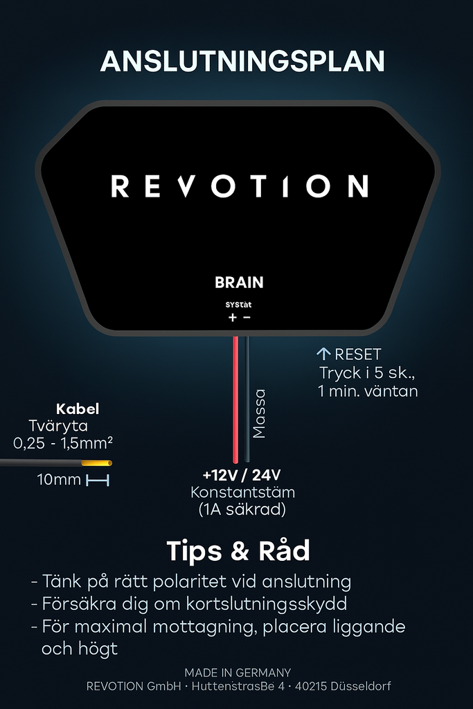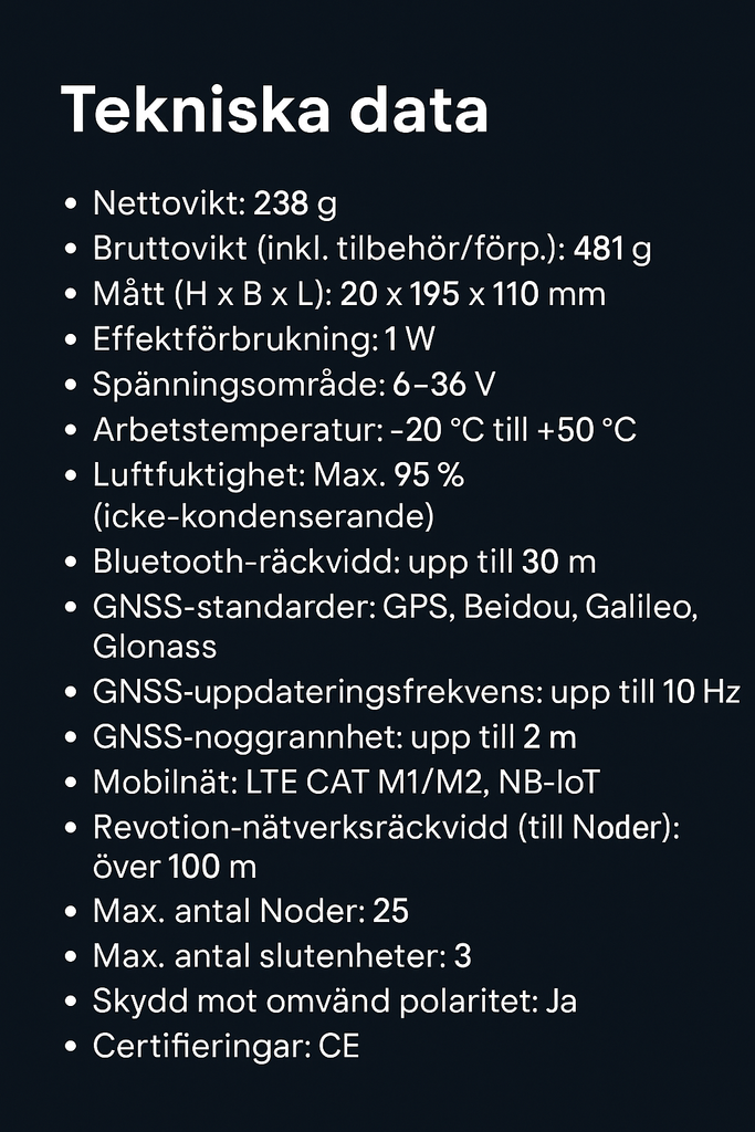 REVOTION BRAIN är en trådlös centralenhet som kopplar ihop alla moduler utan kablar. Med Bluetooth, LTE-M och inbyggd GPS får du mobilstyrning, fjärråtkomst och säkerhet i ett – idealiskt för husbil, off-grid och mobila applikationer.