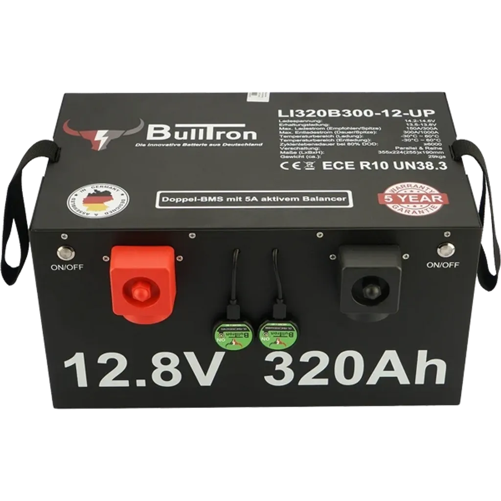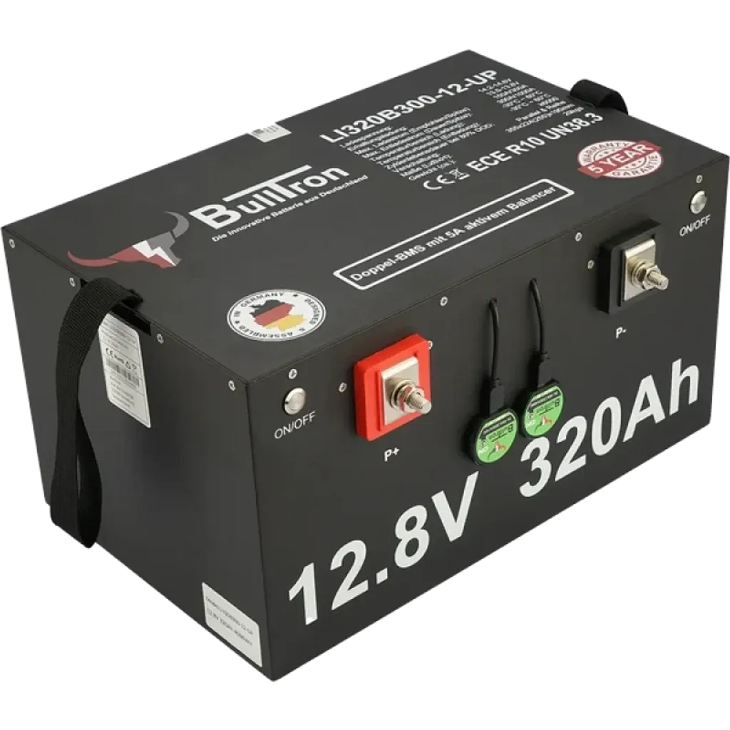 BullTron 320Ah är ett lätt och kompakt litiumbatteri med inbyggd värme, Bluetooth-övervakning och 5 års garanti. Klarar -30 °C till +60 °C och ersätter upp till 640Ah blybatterier. Perfekt för husbil, båt och off-grid. Tysk kvalitet med lång livslängd och över 6 000 cykler.
