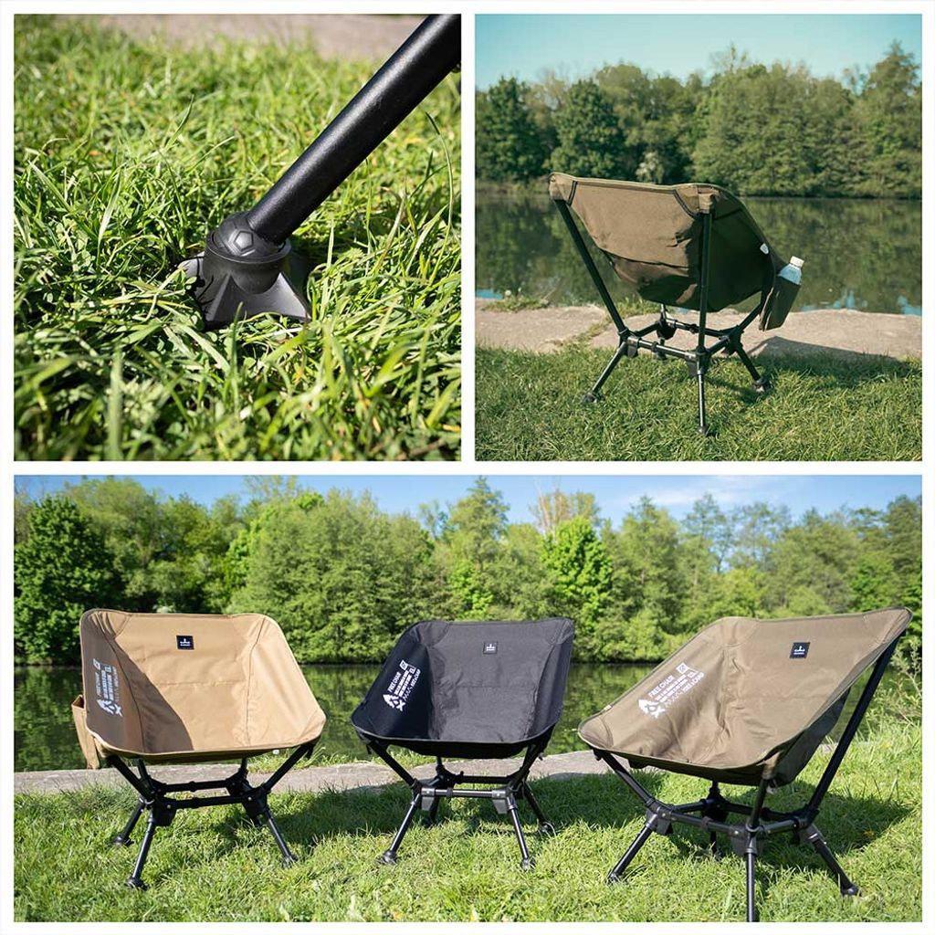 Stolen är byggd i 7075-aluminium och slitstarkt 600D Oxford-tyg. Kombinationen ger hög styrka och låg vikt, vilket gör att stolen klarar upp till 150 kg belastning. Den ergonomiska sitsen ger bra stöd under längre stunder och gör stolen bekväm oavsett underlag.