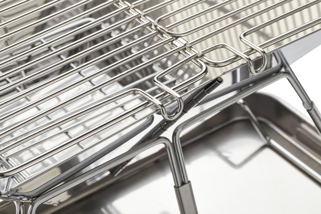 Grillen är tillverkad i rostfritt stål som tål höga temperaturer och frekvent användning. Materialet ger lång livslängd och enkel rengöring samtidigt som den silverfärgade ytan behåller sitt rena, klassiska utseende även efter många grillkvällar.