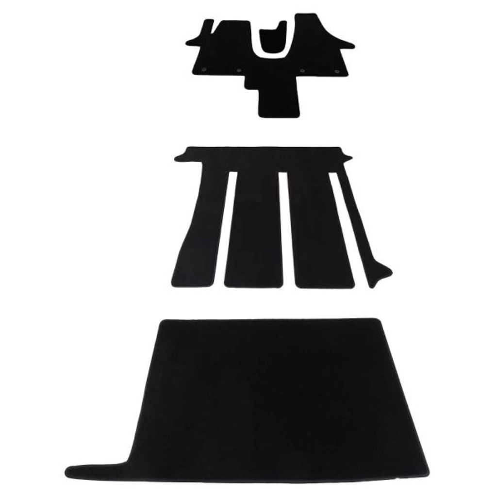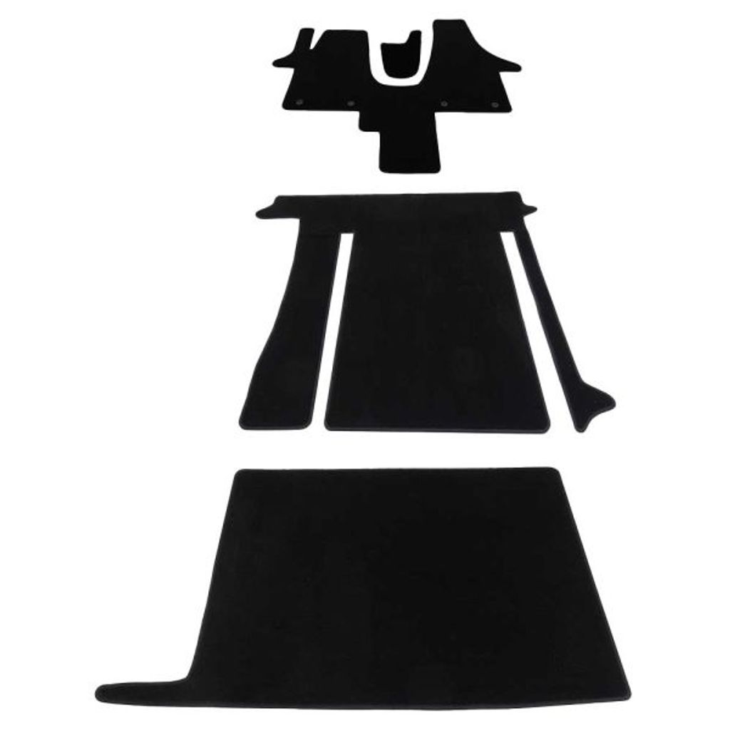 Setet består av tre delar som täcker förarhytt, passagerarsida och mittgång. Mattorna är tillverkade i slitstark textil med halkfri undersida som ligger stadigt även under körning. Materialet är enkelt att rengöra, tål väta och håller länge även vid frekvent användning – idealiskt för både vardag och camping.