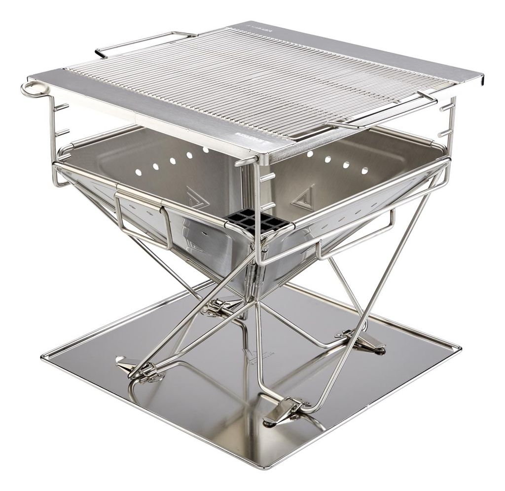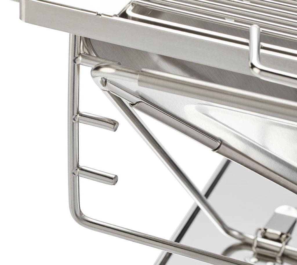Den är tillverkad i slitstarkt stål med silverfärgad finish som tål intensiv värme och daglig användning. Konstruktionen är genomtänkt för att möjliggöra snabb montering utan verktyg, och alla delar kan packas kompakt för enkel transport i bil eller campinglåda.