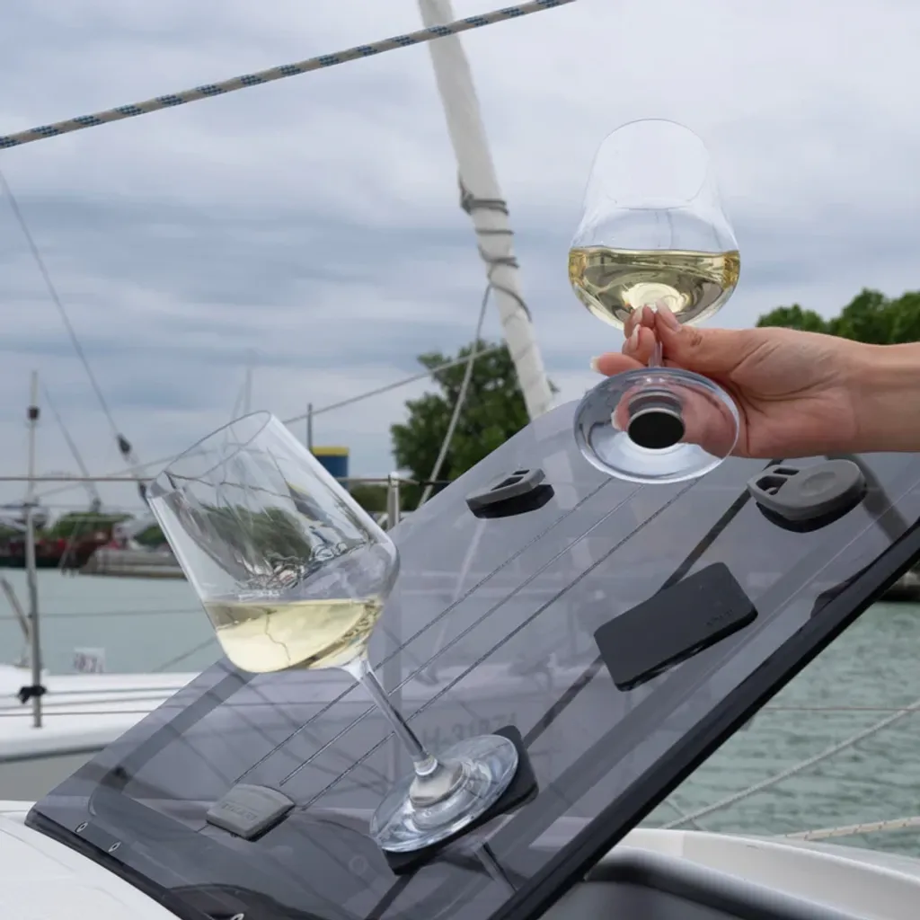 Varje glas har en handgjuten magnet i botten som greppar tag i Nano-Gel-kudden. Magnetkraften är noggrant avvägd så att glasen sitter stadigt men kan lyftas enkelt vid användning – perfekt för moderna äventyr. De självhäftande padsen placeras på plana ytor som bord, brickor eller bänkar och håller fast glasen även vid skakig körning eller guppande sjö.