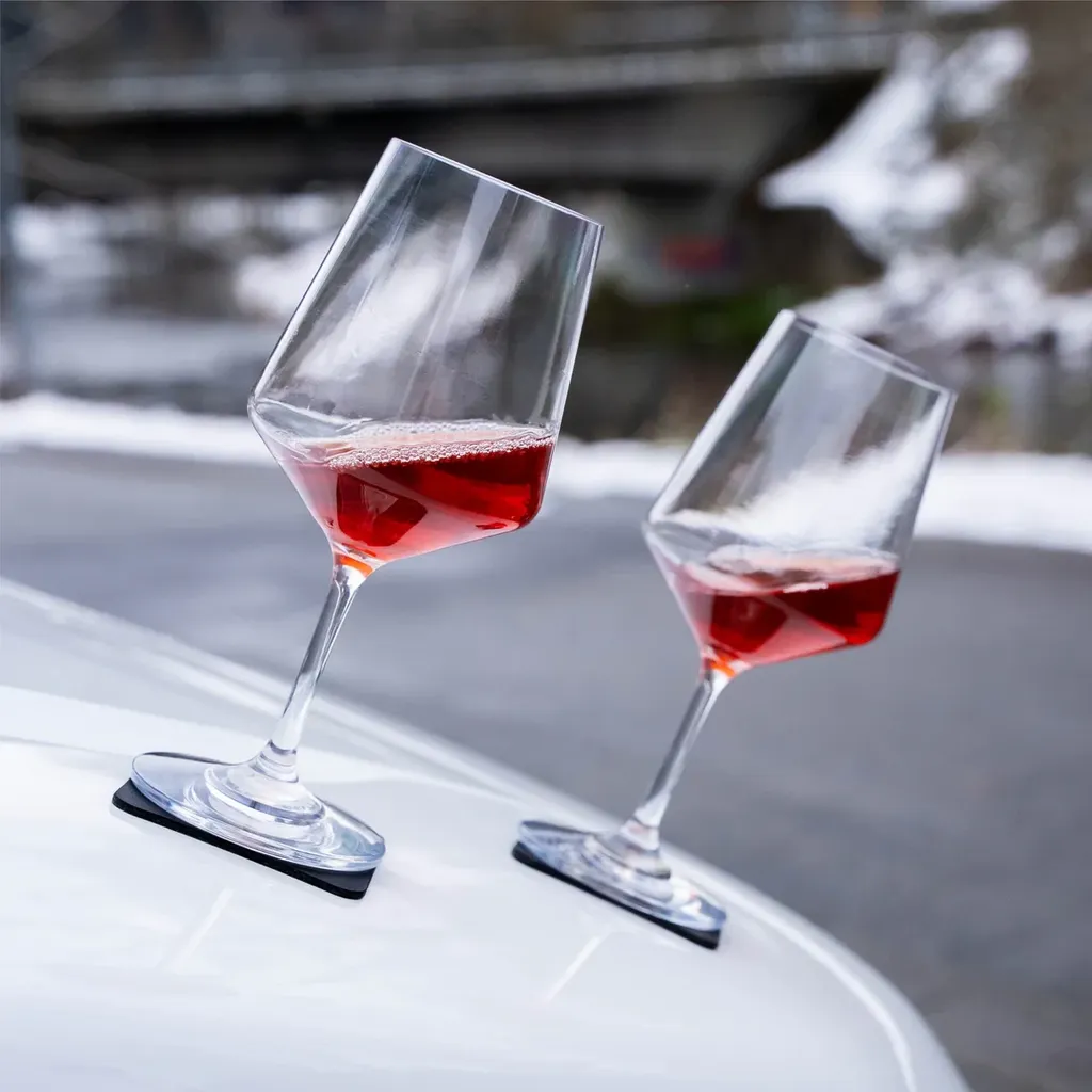 Magnetiska plastglas WINE CLASSIC – set om två. Inkluderar två robusta plastglas med integrerade magneter och två självhäftande metall-Nano-Gel-pads i svart. Glasen är BPA-fria, ser ut som riktigt glas och håller stadigt även under körning. Testade för säkerhet och tillverkade i Tyskland.