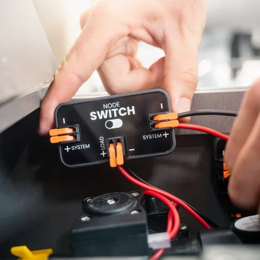 NODE Switch är en digital strömbrytare som låter dig styra upp till fem olika enheter med full kontroll. Varje utgång klarar upp till 20 ampere, vilket gör den perfekt för att hantera elektriska förbrukare i husbil, båt, off-grid-anläggning eller andra mobila energisystem.