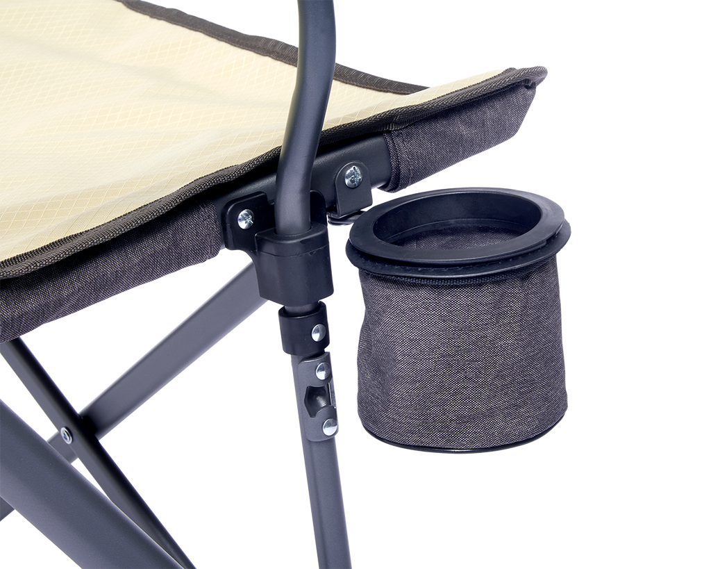 Praktiska funktioner ingår: en integrerad flaska- och burkhållare som är flexibel att placera, samt en inbyggd kapsylöppnare för bekvämlighet på utflykten. Avtagbara armstöd med rengöringsvänligt överdrag gör det lätt att hålla stolen fräsch. Ryggstödet når cirka 90 cm, vilket ger gott stöd för överkroppen.