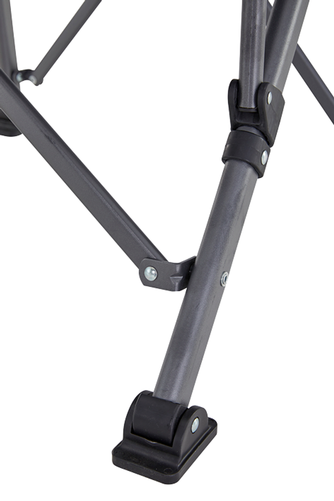 Stolen har en kraftig stålram med pulverlack som klarar upp till 120 kg, och de extra breda fötterna förhindrar nedträngning i mjuka underlag som sand och gräs. Sits och ryggstöd är sydda i slitstark 600D rip‑stop polyester – ett tåligt material som andas och håller formen, vilket även tål regnstänk och intensiv användning.