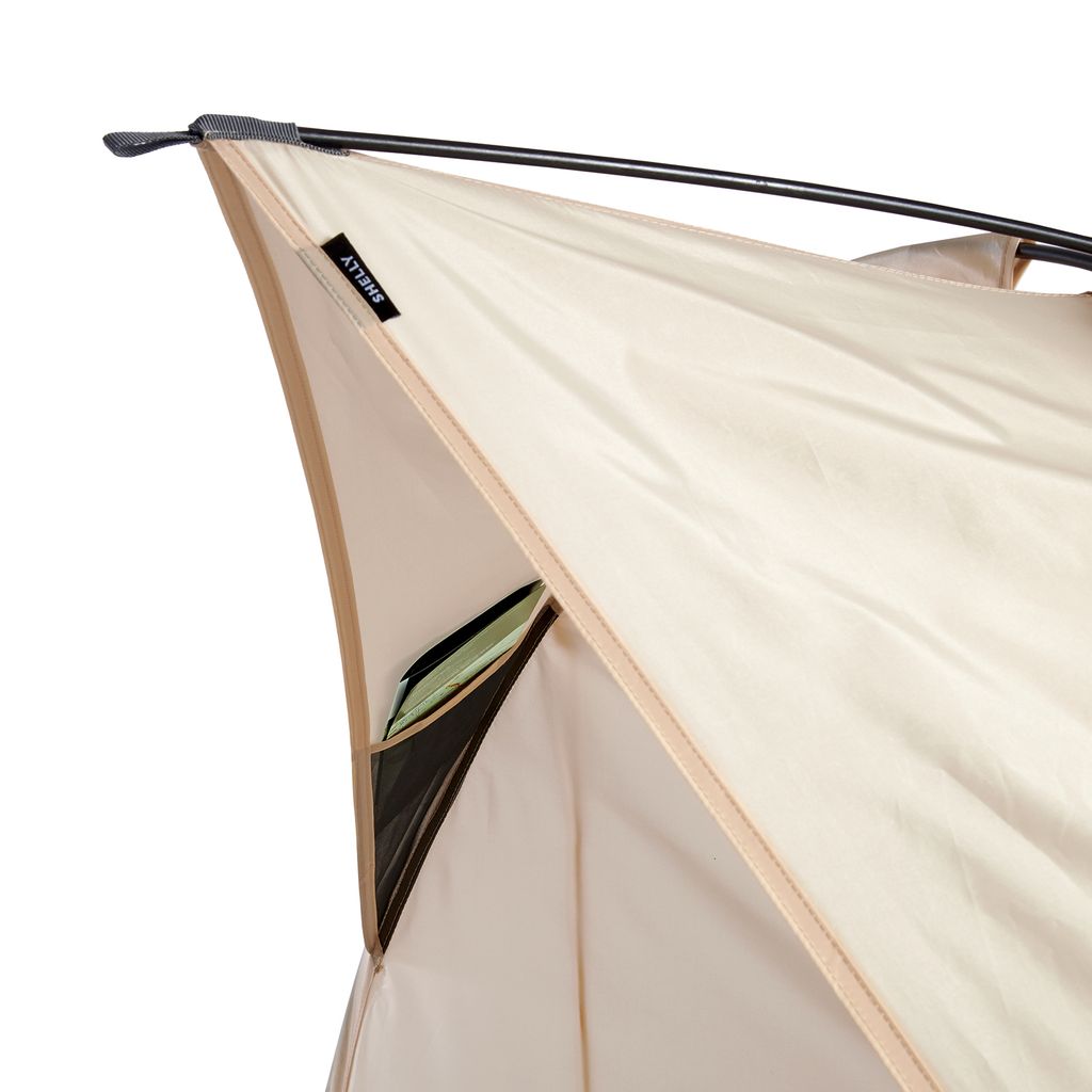 Yttertyget är vattenavvisande och har ett effektivt UV-skydd med UPF 50+, vilket skyddar mot både UVA- och UVB-strålar. Den vattentäta botten gör att du kan placera väskor, handdukar eller bara sitta bekvämt utan att bli blöt underifrån. Tältet är snabbt att sätta upp och lika enkelt att packa ner igen.