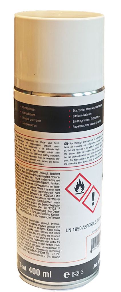 Specialrengöringsspray 400 ml för rengöring inför limning och tätning på husvagn, båt och fordon. Tar bort fett, smuts och oljerester utan att skada ytan. Skonsam formula utan slipmedel. Skumstruktur ger längre verkningstid. Enkel att använda – spraya och torka av. Förbättrar vidhäftning och minskar blåsbildning. Ett viktigt steg för hållbara tätningar.