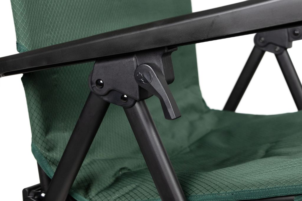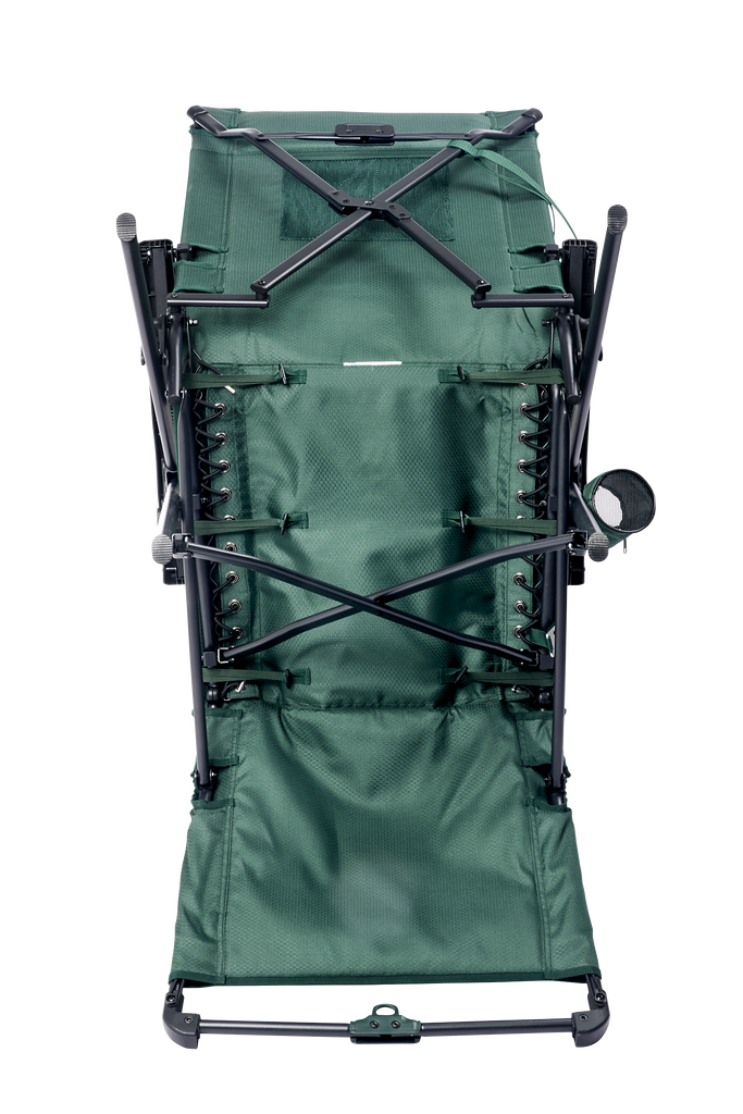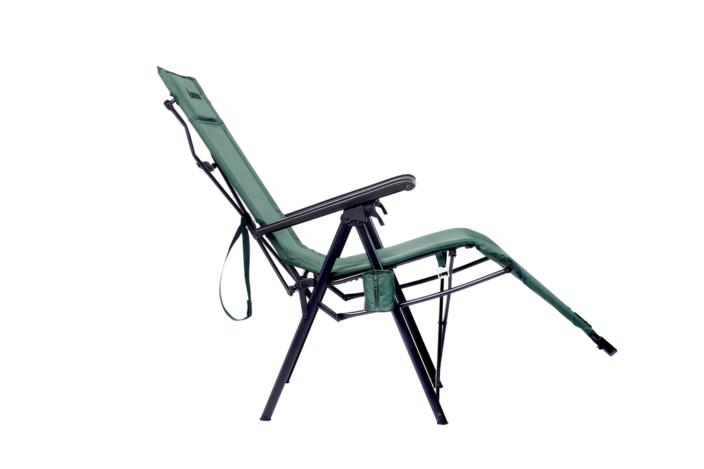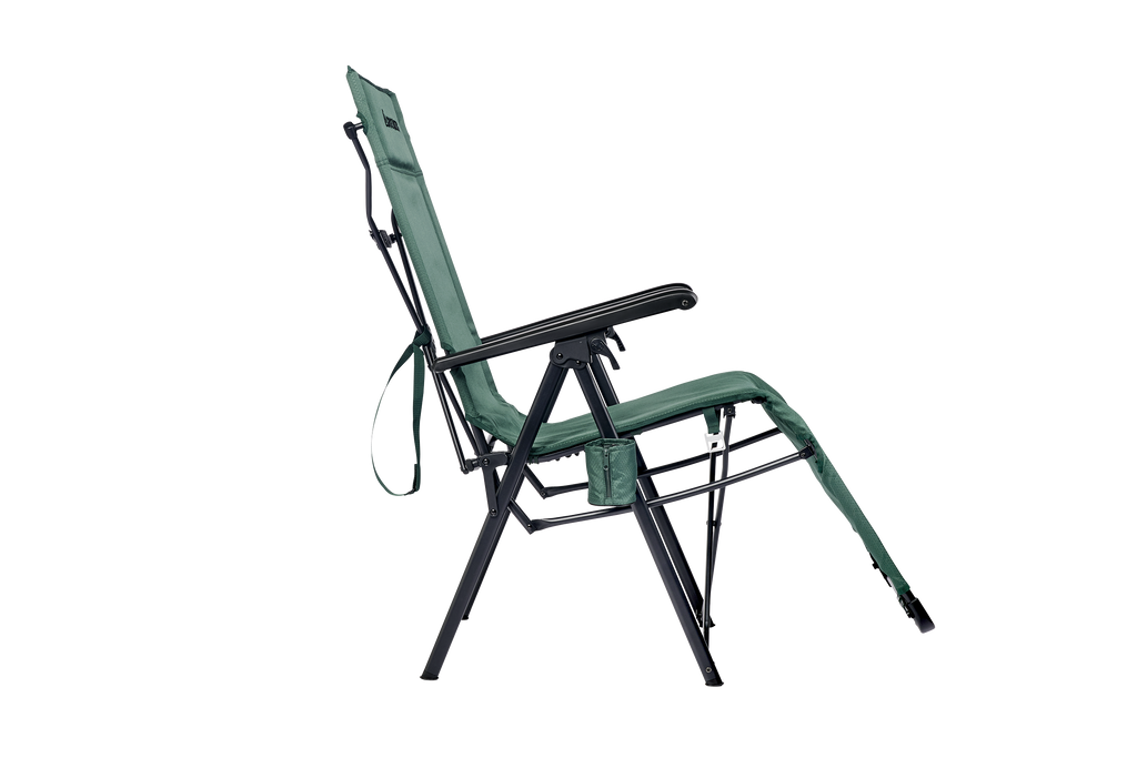 Ergonomisk och hållbar campingstol med justerbar sitt- och liggposition. Tillverkad i RPET och stål, med ryggficka, avtagbar klädsel och integrerad flasköppnare för ultimat komfort.