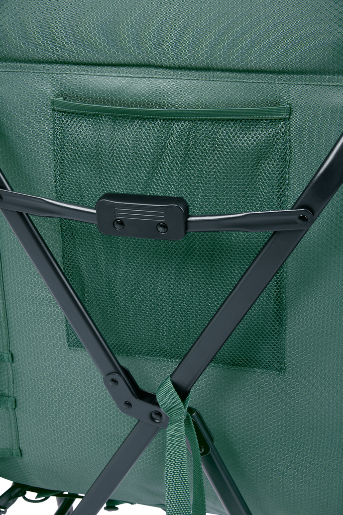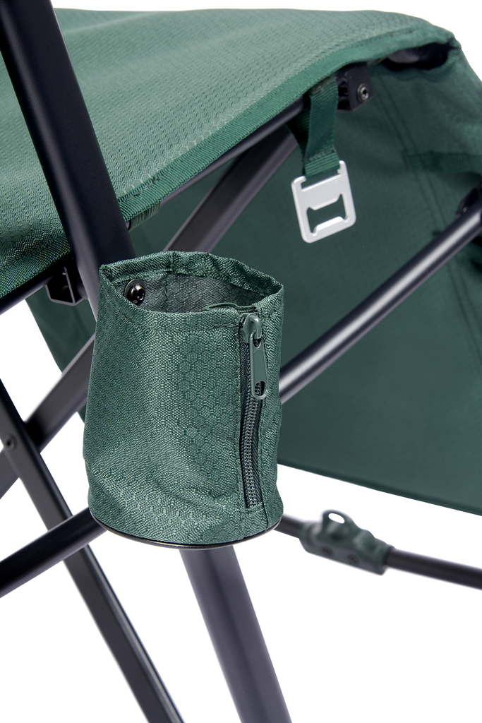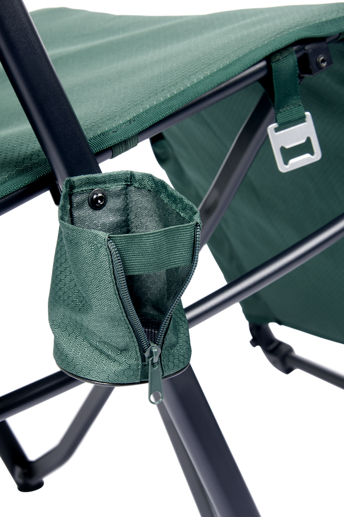 Klädseln är avtagbar och kan handtvättas, vilket gör stolen enkel att underhålla. Tyget är färgat med miljövänlig Dope Dyed Yarn-teknik som minskar vattenförbrukningen och behåller färgen längre. En ryggficka ger praktisk förvaring för tidningar eller glasögon, och en integrerad mobil flasköppnare gör stolen extra användbar vid utflykter och grillkvällar.