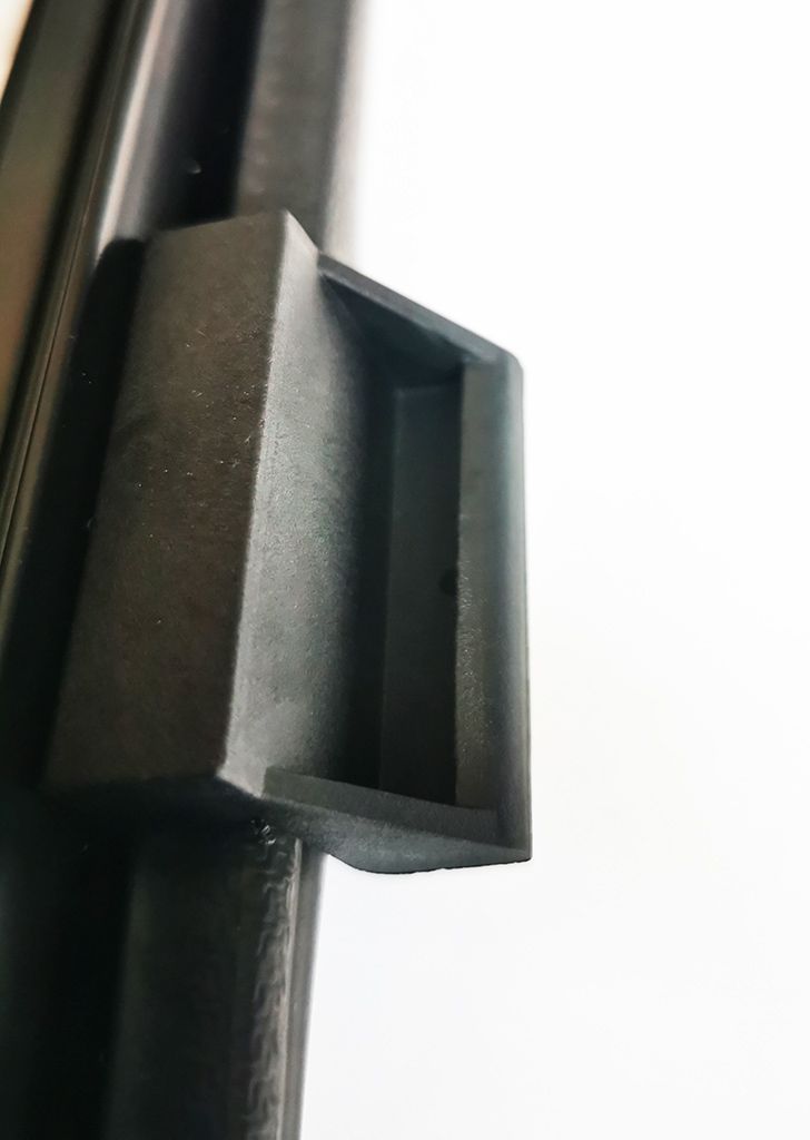Den pulverlackerade aluminiumprofilen ger låg vikt, god isolering och en jämn yta. Fönsterbladet är steglöst skjutbart och UV‑beständigt. Ramen bygger ut 13 mm, medan hela enheten inkl. skjutdelen är 21 mm djup.