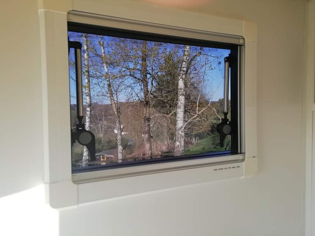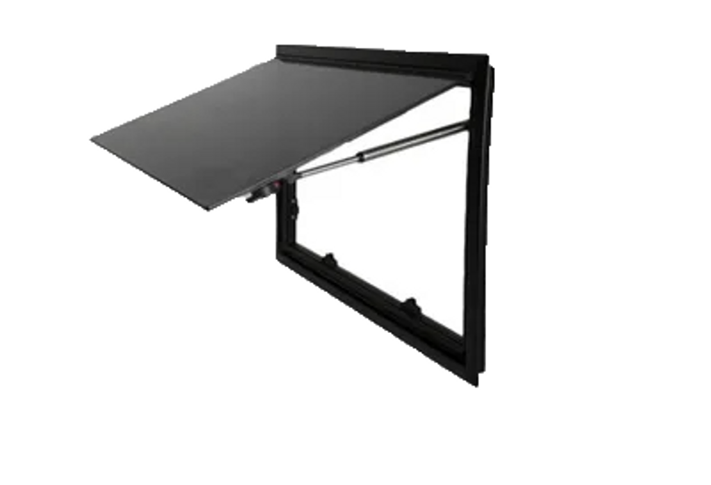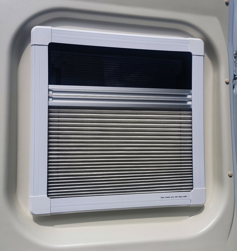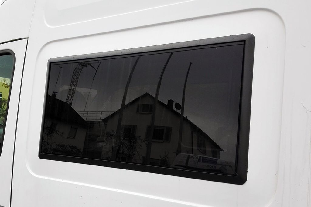Tonat och dubbelglasat utåtgående sidofönster för husbil och van med böjd kaross. Ger tät, plan montering utan modifiering samt integrerat myggnät och mörkläggning.