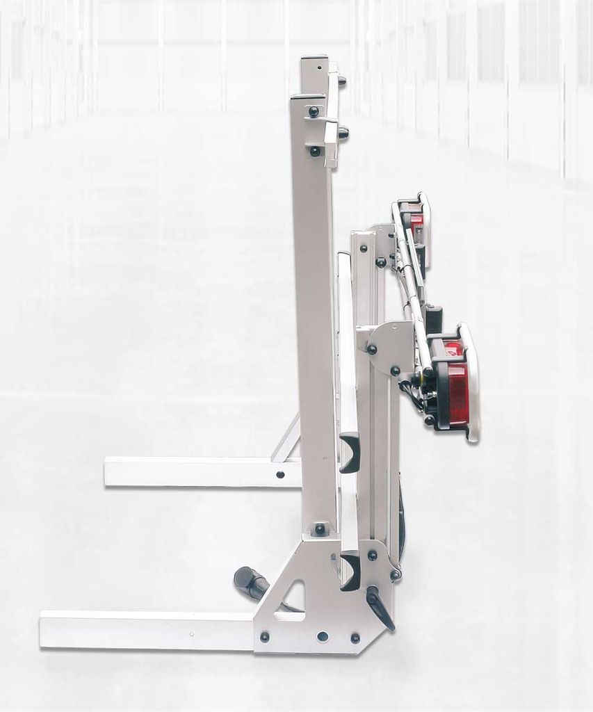 När hållaren inte används kan den enkelt fällas upp och låsas mot en stabil stödbygel. Detta sparar utrymme och ger dig fri åtkomst till bakre delen av husbilen. Endast de fordonsspecifika stålfästena monteras permanent på chassit, vilket gör att själva hållaren som väger cirka 20 kg lätt kan tas av och på vid behov – helt utan verktyg.