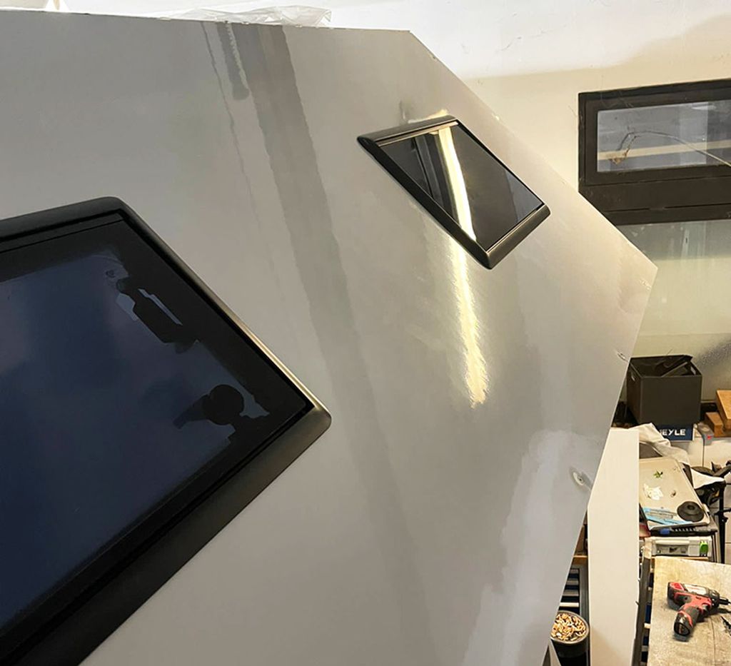 Fönstret är uppbyggt med tre aluminiumramar som tillsammans ger hög stabilitet och ett säkert montage. Den robusta konstruktionen är anpassad för mobilt bruk och klarar påfrestningar från vibrationer och varierande klimat.