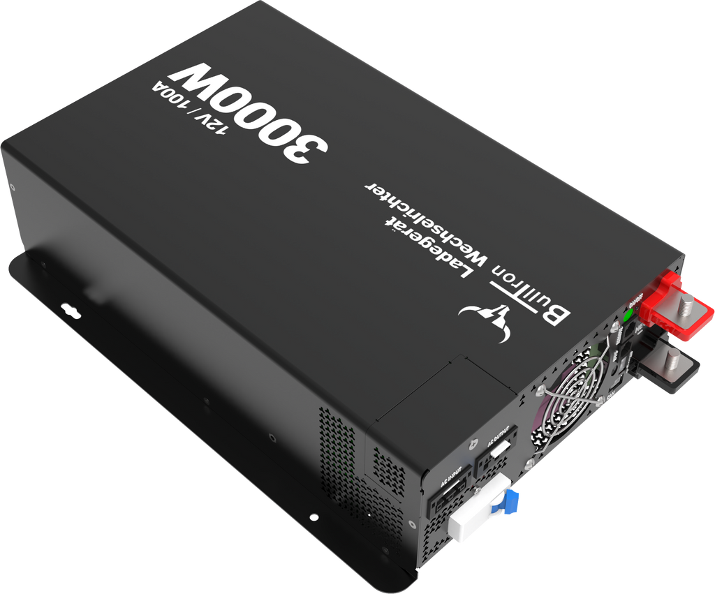 Kompakt och kraftfull växelriktare för husbil med 3000 W effekt och 100 A laddare. Utrustad med nätprioritering, 16 A säkring och FI-skydd för säker drift. Designad för enkel installation, låg vikt och minimal platsåtgång. Klarar hushållsapparater och snabb laddning av stora batterier både med landström och fristående drift.